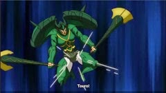 Voltando a dulpla dinâmica, Deba e Dokho… Deba se prepara para lutar com Hércules. Dokho dá um grito de incentivo(?!). Na boa, acho que o pensamento do Deba quando escutou aquilo foi: “Cala boca seu merda!” virava e soltava um “Grande Chifre” para cima dele. Mas ele só vestiu a armadura. Hércules parte para cima de Deba, que não se move. Toma-lhe golpe e nada do touro se mexer…